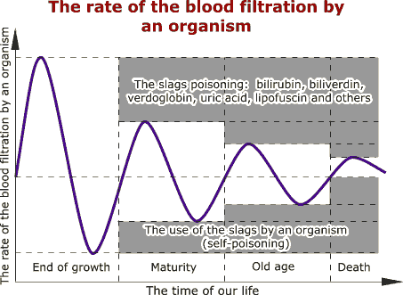 A blood filtration in the biofilters varies together with the growth of cellular losses. The diagram of filtration depending on age is shown on the figure 15. It is easy to understand, that it is the diagram of an organism self-poisoning. It is evidently shown on the figure that with time we remove less and less organic slags (the abscissa of the diagram reflects the years of spend life and the ordinate - the amount of removed slags), leaving more and more of them in an organism.